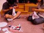 その後,今日中に乾かないと踏んだので,2の時点で今日の作業はストップ。衣装・小道具さんのお手伝いに回りました。ミシンが不調なので,手縫いでがんばる部員たち。「みんなでやれば早く終わる」が今後の鉄則です。