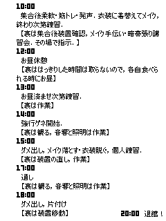 その間,役者たちは何をしていたかというと,軽く通しを行ってみたり(もちろん演出からの指導・注文アリ)キャラ設定を深めてみたりしていました。