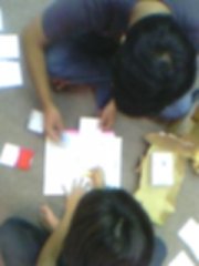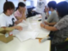 すっかり寂しくなってしまった舞台上では,役者達の話し合いと,宣伝用ポストカードの「郵便番号枠のハンコ押し」が行われています。