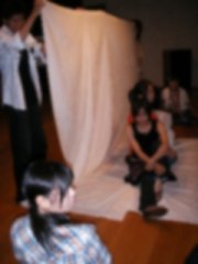 理想の白壁がなかったため,みんなで共同作業しました。背の高い3人が布持ちの役目をし,写真撮影~。この時撮影した写真は,その後加工をしてポスターとして出回ります。